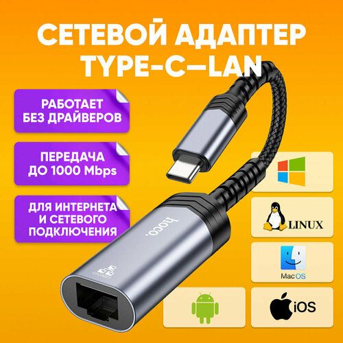 Найти - Сетевой Ethernet адаптер переходник USB Type-C - LAN Rj45 HOCO UA26, черный / Лан-кабель коннектор 1000 Mbps для интернет кабеля / Внешняя сетевая карта USB Type-C - Ethernet RJ45