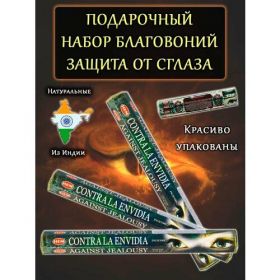 Набор благовоний HEM, аромат Against Jealosy - древесно-пряной (в парфюмернцю композицию входят - можжевельник, осина, сандал, ладан). Аромат помогает расслабиться и укрепляет ауру. Использует, в качестве защитного оберега от сглаза, завистливых людей. Палочки изготовлены на угольной основе в ручную, бамбуковая основа. В одной коробке 20 штук, длина одной палочки 23 см. Упаковка подарочная - прозрачный пакетик с вкладышом-описанием. При их горении чувствуется только аромат масла-наполнителя, потому что сам уголь тлеет без какого-либо запаха. Одна палочка горит (тлеет) около 1 часа. Благовония применяют для гармонизации и очищения пространства, используют в качестве антидепрессанта и антистресса, для улучшения эмоционального состояния. Их жгут во время медитаций, массажа и занятий йогой. Палочки наполняют дом ароматом, могут быть использованы в качестве освежителя дома или антитабак. Если Вам покажется, что аромат слишком насыщенный, можете достать палочки и поставить их в вазу в качестве декора на полку, они так же будут ароматизировать помещение, только аромат будет более мягкий. Использовать с осторожностью: людям, склонным к аллергиям, с индивидуальной повышенной чувствительностью, беременным и кормящим женщинам. Используйте палочки со специальной подставкой. Не оставляйте горящие аромапалочки без присмотра. Не зажигайте палочки в закрытых, непроветриваемых помещениях.