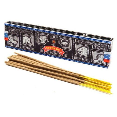 Ароматические палочки Супер Хит фирмы Satya завоевали свою огромную известность благодаря своему лёгкому и мягкому аромату. Благовония сделаны из цветов и растительных компонентов перетёртых в пыль нанесённых на бамбуковую основу. В состав натурального благовония входит: сандал, миндаль и мирра. Эти ароматы, сочетаясь друг с другом, создают неповторимую, гармоничную композицию сладко-медового аромат, помогающего снять нервное напряжение и расслабиться. Благовоние Super Hit помогает достигнуть внутренней гармонии. Мирра устраняет чувство тревоги и страх, способствует спокойному сну. Миндаль помогает восстановить ауру, снимает стрессовое напряжение, борется с депрессией. Сандал - это природный афродезиак, способствует раскрытию новых граней чувственного наслаждения. Благовония Super Hit способствуют в защите от энергетических вампиров. Эти благовония применяют во время процесса медитации, они способствуют раскрытию потенциала личности.