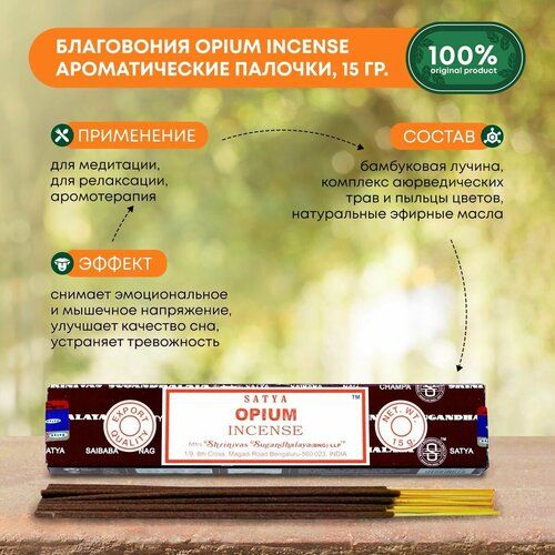 Найти - Благовония Opium Incense (Опиум) Ароматические индийские палочки для дома, йоги и медитации, Satya (Сатья), 15г