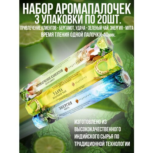 Найти - Благовония, Ароматические палочки, Набор аромапалочекИндокитай 3упак по 20шт: Мята, Бергамот, Зеленый чай