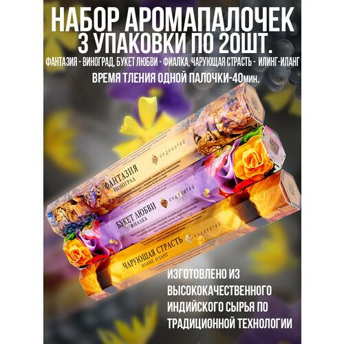 Найти - Благовония, Ароматические палочки, Набор аромапалочек Индокитай3упак по 20шт: Фиалка, Иланг-Иланг, Виноград
