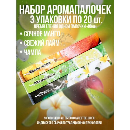 Найти - Благовония, Ароматические палочки, Набор аромапалочек Индокитай3 упак по 20шт: Свежий лайм, Чампа, Сочный манго