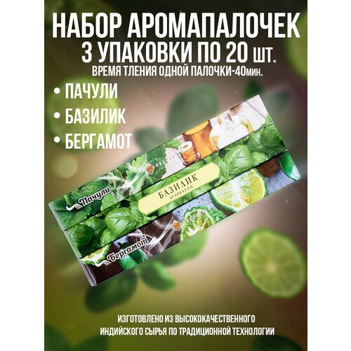 Найти - Благовония, Ароматические палочки,Индокитай(набор 60шт/3 аромата): Пачули, Базилик, Бергамот