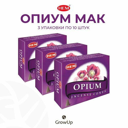 Набор HEM Опиум Мак - 3 упаковки по 10 шт - ароматические благовония, конусовидные, конусы с подставкой, Opium - ХЕМ