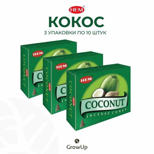 Набор HEM Кокос - 3 упаковки по 10 шт - ароматические благовония, конусовидные, конусы с подставкой, Coconut - ХЕМ