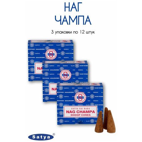 Набор Satya Наг Чампа - 3 упаковки по 12 шт - ароматические благовония, конусовидные, конусы с подставкой, Nag Champa - Сатия, Сатья
