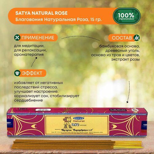 Найти - Благовония Satya Natural Rose, Сатья Натуральная Роза, ароматические палочки, индийские, для дома, медитации, 15г