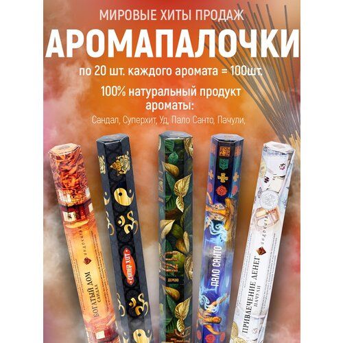НАЙТИ ВЫГОДНЕЕ - Аромапалочки Индокитай с набором без поставки из 5-ти упаковок по 20 штук: Пало Санта, Уд, Сандал, Супер Хит, Пачули.