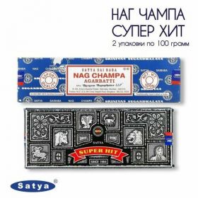 Набор Satya Сатья Супер Хит и Наг Чампа - 2 упаковки по 100 гр - ароматические благовония, палочки, Super Hit, Nag Champa - Сатия, Сатья 102225745762