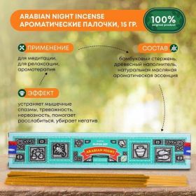 Благовония «Арабская ночь» от индийского производителя Satya обладают глубоким, насыщенным, терпким и пряным ароматом, характерным для Востока. Благовония помогут расслабиться, снять нервное и физическое перенапряжение, снизить нервозность и уровень стресса, погрузиться в атмосферу тотального расслабления и покоя. Особенно благовония Arabian Night подойдут для сеансов массажа, йоги, медитаций, а также других духовных практик. Нежно-сладкий, пряный, с нотками свежести. Начальная нота- грейпфрут, мята, лотос. Нота cсердца - иланг-иланг, жасмин, лаванда. Шлейф- пачули, сандал, мускус. Благовония созданы на основе популярных ароматических палочек "Супер Хит". К полюбившемуся аромату добавлены фруктовые, цветочные, древесные и специевые ноты. Благовония с ярким названием «Арабская ночь» подходят любителям насыщенных запахов. Глубокий аромат наполнен травяной терпкостью и изысканными нотами пряностей. Продукт изготовлен вручную из природных компонентов. В состав входит бамбуковая основа, древесный наполнитель, эфирные масла, смесь специй и измельченные травы. «Арабская ночь» станет прекрасным дополнением к сеансу массажа, йогической или духовной практике. Ароматерапия помогает отпустить негативные мысли и снять физическое напряжение, снижает уровень стресса, погружает в атмосферу покоя и полного расслабления. Важно впустить поток свежего воздуха в окуриваемое помещение, чтобы сохранить приятную концентрацию запаха. При возникновении признаков аллергии использовать с осторожностью. Способ применения: 1. Поднесите ароматическую палочку к источнику открытого огня. 2. Дождитесь воспламенения края палочки. 3. Сбейте пламя ароматической палочки, воздействуя на неё интенсивными потоками воздуха. 4. Установите тлеющую палочку в специальную подставку, или удерживайте её вертикально в руках.