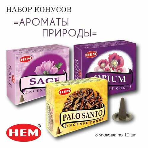 Набор HEM Ароматы природы - 3 упаковки по 10 шт - ароматические благовония, конусовидные, конусы с подставкой - ХЕМ 102429801268