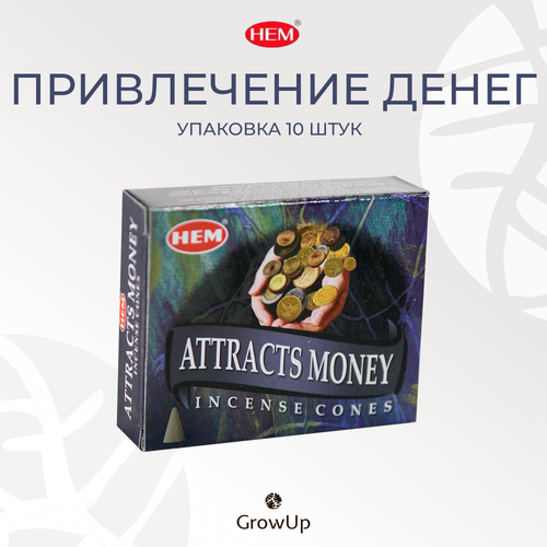 HEM Привлечение денег - 10 шт, ароматические благовония, конусовидные, конусы с подставкой, Attracts Money - аромат легкий, приятный, с пряными нотками - ХЕМ