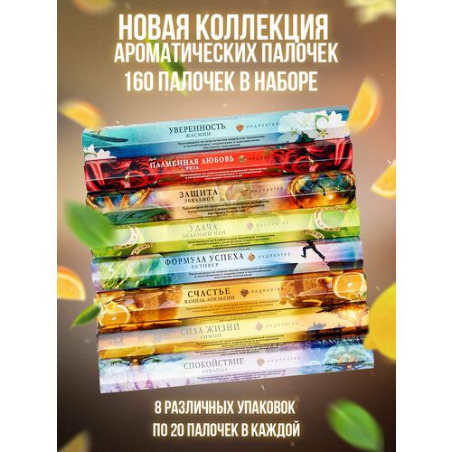В данном наборе благовоний восемь различных видов аромапалочек "Спокойствие" (лаванда), "Счастье" (ваниль-апельсин), "Удача" (зеленый чай), "Пламенная любовь" (роза), "Сила Жизни (лимон), "Формула Успеха" (ветивер), "Защита" (эвкалипт), "Уверенность" (Жасмин) . В каждой упаковке 20 аромапалочек, общее количество благовоний в наборе - 160 штук. В наборе данной парфюмерии и ароматов для дома любимые многими ароматы лаванды и ванили. Аромат благовония зеленый чай лимон и ветивер прекрасно освежает воздух и наполняет атмосферой бодрости. Способ применения: палочку зажечь, затем потушить пламя. Тлеющую палочку поместить на подставку. Срок годности палочек в закрытой упаковке неограничен, после вскрытия упаковки - использовать в течении года. Благовония ароматические палочки набор - это прекрасный выбор для тех, кто хочет создать особую атмосферу в своем доме. Этот набор представляет собой сразу несколько видов благовоний, которые смогут разнообразить и обогатить вашу коллекцию ароматерапии. Наслаждайтесь прекрасными ароматами и создавайте уют и гармонию в вашем жилище. Ароматизатор для дома - именно так можно назвать этот набор. Его волшебные благовония, например лаванда или ваниль, помогут заполнить ваше пространство нежным и приятным ароматом, который распространится в каждом уголке, создавая атмосферу уюта и комфорта. Благовония палочки изготовлены из высококачественных ингредиентов, которые максимально сохраняют свои ароматические свойства. Все палочки обладают длительным эффектом, что позволяет наслаждаться их ароматом на протяжении длительного времени. Нежные и изящные, они станут стильным элементом вашего интерьера, а также прекрасным подарком для близких и друзей. Набор ароматических палочек благовония подойдет как для любителей классических запахов, так и для тех, кто предпочитает экзотические ароматы. Все благовонии из набора пропитаны глубокими и насыщенными ароматами, которые смогут подарить вам полное релаксацию и умиротворение. Набор для медитации и релаксации включает в себя самые популярные аромасоставы, которые идеально подходят для проведения медитации или создания атмосферы спокойствия и умиротворения. Погрузитесь в атмосферу Индокитая с ароматами ладана и сандала, которые уже веками используются для балансирования энергии и достижения гармонии. Набор благовоний создан для истинных ценителей ароматерапии и эстетики. В комплекте вы найдете ароматические палочки с легким и ненавязчивым ароматом, а также палочки с более интенсивными и запоминающимися запахами. Создайте свою уникальную атмосферу в доме с помощью этого набора благовоний и наслаждайтесь ее волшебством каждый день. Уникальные ароматические палочки благовония позволят вам создать атмосферу спокойствия и релаксации в любом помещении. Индийские благовония являются настоящими шедеврами парфюмерии для дома. Их неповторимые ароматы погрузят вас в мир эстетики и индийской культуры. Превратите ваш дом в уютное пространство, наполненное нежными ароматами благовоний. Набор благовоний - это не только прекрасное дополнение к вашему интерьеру, но и возможность создавать уникальные ароматические композиции. Используйте разные комбинации палочек благовоний, чтобы достичь желаемого эффекта. Освежите воздух в вашем доме, наполните его приятным з