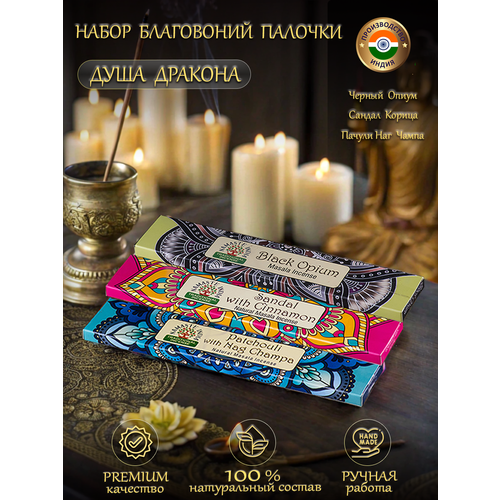 Ароматы раскрывают внутреннюю силу, глубину и мудрость, настраивают на серьезные размышления и помогают раскрыть эмоциональные и духовные аспекты человека. «Душа дракона» — это набор для тех, кто ищет гармонии и уединения, стремится к внутреннему пониманию и хочет окружить себя атмосферой тепла, таинственности и уверенности. Сочетание ароматов Пачули и наг Чампа, Черного опиума, Сандала с корицей и Пачули в этом наборе создает настоящую симфонию ароматов, которая подарит наслаждение и релакс.