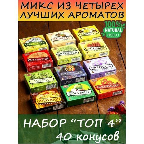 Подарочный набор благовония конусы HEM - арома микс из 4-х супер хит ароматов: сандал, ладан, пало санто, ваниль, опиум, роза, плюмерия, пачули, лес, коко,с зеленый чай, корица, пожелание удачи, привлечение денег, золотой дождь. Ароматизатор для дома в виде благовоний конусов, как и ароматические палочки доступен в различных ароматах на основе комбинации ингредиентов. Конусные благовония имеют другой запах чем у аромапалочек, более однородный так как в них нет горения палочки. Конусы в подставке курильнице выпускают спиральный (не стелющийся) дым из верхней части конуса в сочетании с успокаивающими ароматами, которые расслабляют и создают приятную спокойную обстановку в вашем доме или офисе. Благовония во всем мире используются для медитации релакса массажа спа, для очищения и окуривания пространства, как ароматерапия. Запах тления действует как освежитель воздуха дома офиса, антистресс антитабак как диффузор (аромадиффузор с палочками). В каждом наборе 4 разных вида конусов по 10 штук, всего 40 штук и подарок) Среднее время тления 1 конуса 30 минут. HEM – это самая популярная корпорация в мире которая уже несколько десятилетий осуществляет поставки на российский и мировой рынок - более чем в 75 стран по всему миру. При изготовлении ароматических средств индийские мастера используют сочетание древних секретов и новейших технологий. Данная тенденция позволила завоевать мировую популярность. Агарбатти ароматные безопасные экологичные и соответствуют высочайшим стандартам. В нашем ассортименте для вас представлен большой выбор от ведущих производителей хем и сатья: масала masala super hit супер хит пуля - конусы классические и обратного потока back flow cones и подставки для конусов- курильница интерьерная. ароматизатор подарки женщине учительнице на новый год и рождество любимой на день рождения парфюмерия аромасвечи ароматический диффузор табак. Наш ароманабор станет лучшим для особого случая родных близких людей женщинам. Мы хотим что бы у каждого была возможность получить частичку Индии по доступной цене