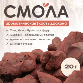 Смола «Кровь Дракона» — это ароматическое вещество природного происхождения, получаемое из пальмового растения Daemonorops draco, которое встречается в Юго-Восточной Азии. Смола поставляется в виде плотных кусочков бордового цвета и предназначена для ароматизации помещений, создания уютной обстановки и помощи в расслаблении после напряжённого дня.