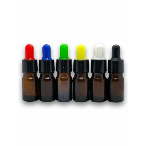 Найти - Набор пипеток для эфирных масел, флакон 5 мл, 6 штук, янтарное стекло, черная крышка, разноцветная груша