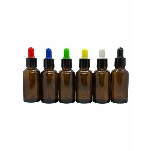 Найти - Набор пипеток для эфирных масел, флакон 30 мл, 6 штук, янтарное стекло, черная крышка, разноцветная груша