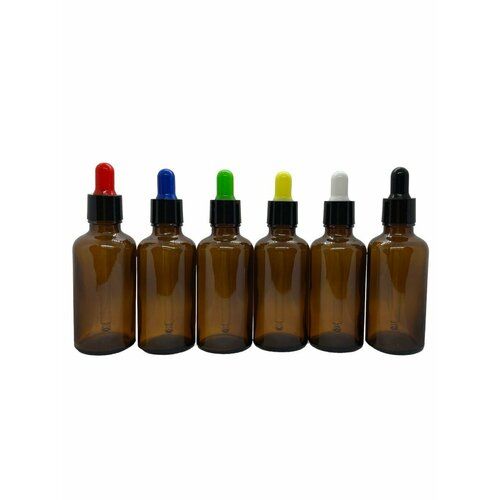 Найти - Набор пипеток для эфирных масел, флакон 50 мл, 6 штук, янтарное стекло, черная крышка, разноцветная груша