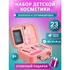 В набор входят тени для век, помада для губ, лак для ногтей (лак снимается одним движением), блёстки для ногтей. Также в комплект включены аппликаторы и кисточки для нанесения макияжа, разделитель для пальцев, пилочка для ногтей, а также косметичка в виде чемоданчика. Набор рекомендован детям от 3-х лет. Это идеальный возраст для знакомства с миром красоты и самовыражения. Самое главное - эта косметика безопасна для детей. Применяемые компоненты полностью одобрены дерматологами и не вызывают раздражения кожи. Так что родители могут быть спокойны за здоровье своих маленьких принцесс. Размер набора 20 на 14 на 8 см, что делает его компактным и удобным.