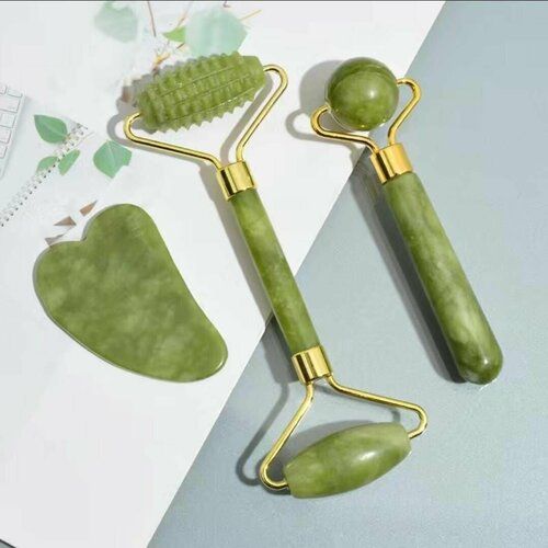 НАЙТИ ВЫГОДНЕЕ - Набор из 3х предметов: Ролик для лица, скребок гуаша и ребристый ролик из натурального нефрита