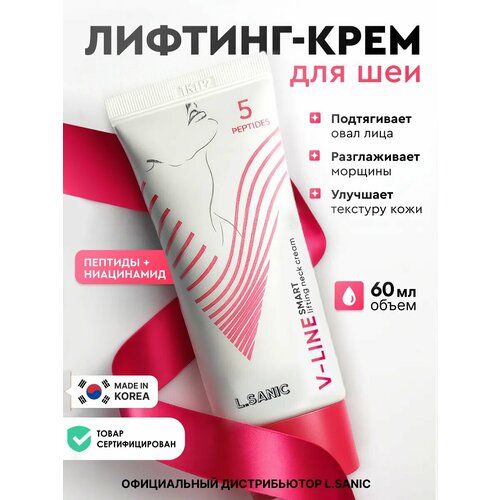 Kрем подтягивающий для подбородка, шеи и зоны декольте, для коррекции овала лица, Корея. Объем - 60 мл. L.Sanic V-line Smart Lifting Neck Cream, 60ml способен вернуть коже лица нежность и молодость, четкий контур и красивый овал. Лифтинг крем оказывает потрясающий подтягивающий эффект. Нежная кожа на шее и зоне декольте постоянно подвергается воздействию внешних факторов, и именно здесь видны первые признаки старения. Крем корректирующий обеспечивает высококачественную поддержку этой области благодаря уникальным ингредиентам, таким как коллаген, масло ши, ниацинамид и комплекс пептидов. Крем для корректировки овала лица также богат натуральными маслами рисовых отрубей и авокадо, которые обогащают эпидермис питательными веществами. Он помогает уменьшить морщины, улучшить текстуру кожи и придать ей сияние. Пептиды восстанавливают кожу и ускоряют заживление повреждений, разглаживают морщинки. Почувствуйте великолепный эффект лифтинга и подтяжки овала лица уже после первого применения, и наслаждайтесь молодой и упругой кожей на шее и зоне декольте. Это бесценный подарок с лифтинг комплексом для вашей кожи, который она так заслуживает. Прекрасно дополняет уход за собой, направленный против признаков появления морщин. Подходит для всех типов кожи, особенно для зрелой, которой требуется омолаживающий ( антивозрастной ) уход. Применение: наносите на чистую и сухую кожу шеи и зоны декольте, массируя легкими движениями снизу вверх. Для достижения максимального результата anti age используйте утром и / или вечером. Для усиления эффекта подтяжки можете чередовать использование крема и маски - бандажа V-line. Рекомендуем к использованию в комплексе с серией корейской косметики L. Sanic.