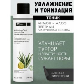 Увлажняющий тоник BTpeel содержит комплекс самых лучших увлажняющих средств современной косметологии: гиалуроновую кислоту, пептиды, экстракт лимона и сок листьев алоэ вера. Благодаря этим передовым компонентам в составе тонизирующего средства кожа лица выглядит увлажненной, ухоженной и обновленной. Тоник отлично тонизирует и стимулирует кожу, сужает расширенные поры, снимает покраснения. Кроме того, препарат улучшает регенерацию и улучшение тургора кожи кожи за счет того, что успешно стимулирует синтез волокон коллагена и эластина, благодаря комплексу пептидов, входящих в состав тоника. Кожа восстанавливает оптимальный уровень увлажнения, становится мягкой и свежей. Тоник обладает противовоспалительным свойством и успокаивающим действием, восстанавливает гидролипидную мантию кожи. Не содержит спирт, красители и химические отдушки.