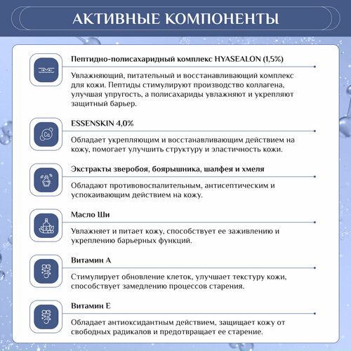 Активные компоненты: Essenskin TM, Натрия гиалуронат, Витамин А, Аллантоин, Экстракты: зверобоя, боярышника, шалфея, хмеля, Масло Ши, Сорбитол, Витамин Е.