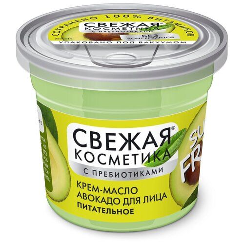 Крем-масло авокадо для лица "Свежая косметика", питательное, 50 мл В этой баночке 100% натуральное питательное крем-масло для лица. Оно приготовлено из самых свежих ингредиентов и пребиотиков без вредных добавок и консервантов небольшое количество крем-масла нанесите на чистую сухую кожу лица и шеи, оставьте до полного впитывания. Подходит для ежедневного использования. После вскрытия хранить не более 30 суток.