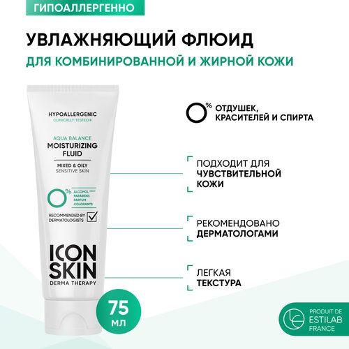 Легкий крем для лица Aqua Balance мгновенно увлажняет и успокаивает чувствительную кожу. Флюид регулирует работу сальных желез, устраняет стянутость и шелушения, укрепляет защитный барьер, благодаря чему кожа становится меньше подвержена воздействию внешних факторов окружающей среды. Легкая текстура флюида обеспечивает приятное скольжение, быстро впитывается, не утяжеляет, не оставляет липкости и ощущения пленки. Рекомендован для ежедневного ухода за жирной и комбинированной чувствительной кожей, склонной к куперозу, появлению покраснений и аллергических реакций. Гипоаллергенная формула НЕ содержит отдушек, красителей и спирта. В состав включены компоненты, родственные коже: пантенол, ниацинамид, мочевина, сквалан. Ниацинамид выравнивает тон лица, способствует уменьшению воспалений, размера пор и пигментации, регулирует жирность кожи. Мочевина входит в состав естественного увлажняющего фактора и помогает поддерживать правильный гидробаланс. Пантенол и сквалан восстанавливают и успокаивают кожу, укрепляют ее естественный защитный барьер. Результат: увлажненная кожа без жирного блеска и раздражений. Способ применения: нанести небольшое количество увлажняющего крема на предварительно очищенную кожу лица, шеи и декольте. Равномерно распределить до полного впитывания. Использовать утром и вечером. В качестве ежедневного очищения комбинированной и жирной чувствительной кожи рекомендуем использовать гель для умывания ICON SKIN Sebo Expert. DERMA THERAPY – дерматологическая серия для ежедневного ухода, одобренная дерматологами. Средства линейки каждый день обеспечивают кожу самым необходим: мягким очищением, увлажнением и защитой