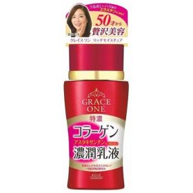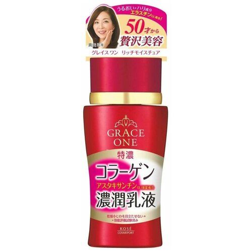 KOSE Grace One Deep Moisture Milk Увлажняющее и питательное молочко для ухода за зрелой кожей лица, с нежным ароматом прованской розы, 130мл. 1/36Увлажняющее и питательное молочко Grace One Deep Moisture Milk от KOSE COSMEPORT - это уход премиум-класса за зрелой кожей лица. Разглаживает и препятствует появлению новых мелких морщин вокруг глаз и губ, осветляет и увлажняет кожу лица и делает её более упругой. Вся серия GRACE ONE от KOSE COSMEPORT содержит уникальный специально разработанный комплекс люксовых увлажняющих ингредиентов, в который входят: плацента, эластин, пептиды, 3 типа гиалуроновой кислоты, 2 типа коллагена. А также оригинальные "красные" увлажняющие компоненты: астаксантин, экстракты граната, розы и шиповника. Оранжевый цвет обусловлен содержанием астаксантина – антиоксиданта №1, который эффективно блокирует действие свободных радикалов и замедляет старение кожи вызванное УФ-излучением. Эластин , содержащийся в молочке, повышает упругость кожи - лицо становится эластичным, упругим и сияет свежестью. Обладает легким ароматом прованской розы. Состав: Вода, BG, глицерин, DPG, астаксантин, сукцинилателоколлаген, экстракт кожуры граната, экстракт цветков розы центифолии, токоферол, гиалуронат натрия, экстракт Haematococcus Pluvialis, гидролизованный эластин, гидролизованная гиалуроновая кислота, водорастворимый коллаген, PEGEA-40, (акрилат / алкилакрилат (C10-30)) кросс-полимер, дикаприновая кислота PG, диметикон, этанол, стеариновая кислота, глицерилстеарат, сорбитана сесквиолеат, цетеариловый спирт, каприловый / каприновый триглицерид, глицерилпальмитин, триэтилгексилат гидроксистеариновая кислота / стеариновая кислота / логоновая кислота) дипентаэритритил, полиакриловая кислота Na, полисольват 80, гидрогенизированное пальмовое масло кокоса, гидрофобный лецитин, этилпарабен, феноксиэтанол, метилпарабен, отдушка, карамель.