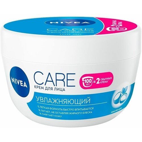 Крем Nivea Дневной увлажнение и питание 100мл 80129 1 шт. NIVEA представляет Care - крем с легкой текстурой, который одновременно увлажняет и интенсивно питает кожу, быстро впитывается и не оставляет жирного блеска - интенсивно питает и быстро впитывается - бережно заботится о коже - способствует регенерации - защищает от негативных факторов внешней среды Увлажняющий крем Care доступен в объеме 100 мл. Увлажнение и интенсивное питание без жирного блеска Крем с легкой текстурой быстро впитывается С Маслом Ши Кожа нежная и увлажненная на весь день В 2 раза больше объем (100 мл)