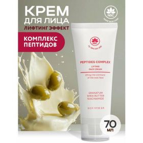 Крем с эффектом лифтинга на основе пептидов способствует усилению выработки коллагеновых и эластиновых волокон, борется с первыми признаками возрастных изменений, возвращает коже эластичность и упругость, разглаживает морщинки. Комплекс пептидов выравнивает рельеф кожи, запускает процессы регенерации клеток, поддерживает четкость овала лица. Экстракт оливы защищает коллаген и эластин от повреждений и предотвращает появление морщин. Ниацинамид нормализует гидролипидный баланс и работу сальных желез, оказывает омолаживающее и противовоспалительное действие. Масло ши активно увлажняет, убирает шелушения и покраснения, возвращает коже здоровый цвет, делает ее мягкой и гладкой. Экстракты граната, корня солодки и ромашки насыщают кожу полезными микроэлементами, успокаивают и борются с пигментацией.