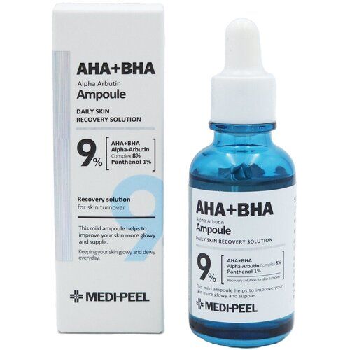 Осветляющая пилинг-ампула с альфа-арбутином Medi-Peel AHA BHA Alpha Arbutin Ampoule стимулирует процессы клеточного обновления, активно отшелушивает ороговевший слой эпидермиса, рассасывает застойные пятна, помогает в борьбе с пигментными пятнами и постакне.