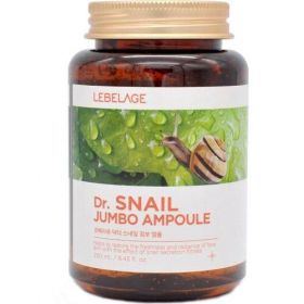 Ампульная сыворотка для лица с муцином улитки Dr. Snail Jumbo Ampoule южнокорейской марки Lebelage подходит всем, особенно для ухода за кожей с признаками возрастных изменений. Она соединяет в себе свойства трёх косметических продуктов: тоника, эссенции и сыворотки. Невесомая гелевая консистенция экономно расходуется, равномерно наносится и мгновенно впитывается полностью, оказывает комплексное действие. Она содержит в себе микрокапсулы с натуральными растительными экстрактами, которые увлажняют, питают и разглаживают кожу, укрепляют её защитные функции, помогают эффективнее противостоять негативному влиянию внешних факторов окружающей среды. Средство укрепляет и уплотняет кожный покров, повышает его упругость и эластичность, имеет регенерирующие свойства, стимулирует регенерацию клеток и восстановление кожи, подтягивает её, сокращает количество и глубину морщин, возвращает здоровое естественное сияние. Состав не содержит минерального масла, парабенов и бензофенона. Способ применения: равномерно нанесите сыворотку на очищенную и тонизированную кожу лица, шеи и области декольте легкими массажными движениями. Дождитесь полного впитывания средства.