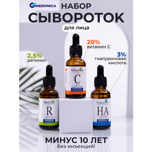Mezonica Face serum set (Hyaluronic Acid + Vitamin C + Retinol 2.5%) Сыворотка для кожи лица Гиалуроновая кислота + Витамин С + Ретинол 2.5%, набор из 3-х сывороток по 30 мл каждая
