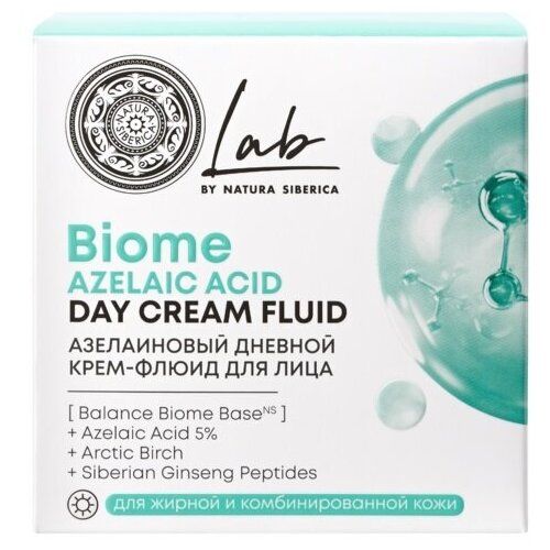 Натура Сиберика LAB Biome Азелаиновый дневной крем-флюид Azelaic Acid для лица, 50 мл, представляет собой профессиональное средство для ухода за кожей лица. Продукт разработан в лаборатории ООО «Натура Сиберика» и содержит органические ингредиенты, такие как экстракты дикорастущих растений Сибири.