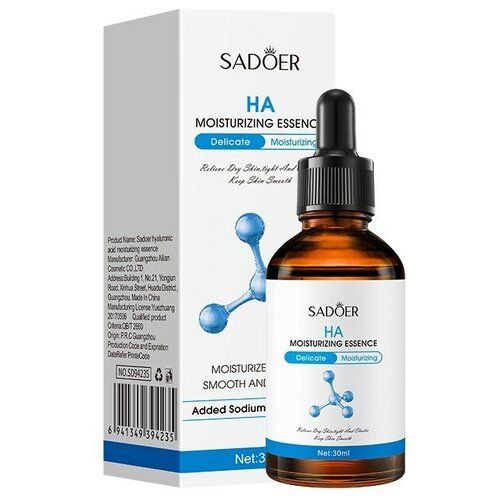Увлажняющая эссенция для лица Sadoer с гиалуроновой кислотой 30 мл. Действие гиалуроновой кислоты направлено на интенсивное увлажнение глубинных слоев эпидермиса, а также на омолаживание и разглаживание кожи. Эссенция подходит как для зрелой, так и для молодой кожи. Гиалуроновая кислота проникает в морщины, заполняет и разглаживает их. Кислота создает на поверхности кожи тончайшую пленку, которая впитывает оптимальное количество влаги, доставляя воду в клетки и запечатывает ее там, не давая влаге испариться. Таким образом предотвращается обезвоживание и высыхание кожи. Кожапостепенно напитывается влагой изнутри, благодаря чему становится ухоженной, сияющей и здоровой. Устраняется чувство сухости, шелушения. Эссенция имеет нежный аромат и быстро впитывается, не оставляя липкой пленки и дискомфорта. За счет этого можно практически сразу наносить на кожу следующее средство ухода, эффект от которого будет усилен действием эссенции. Способ применения: 1. Очистите и умойте лицо. 2. Протрите лицо тоником. 3. Нанесите небольшое количество эссенции на руки, распределите массажными движениями от центра к периферии лица, пока эссенция полностью не впитается.