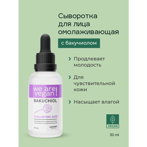 Антиоксидантная сыворотка для лица с бакучиолом и гиалуроновой кислотой от Lavant – современная косметика, созданная для полноценного ухода за кожей. Забудьте о морщинах и прыщах, сыворотка работает на омоложение лица и борется с постакне. Её эффективное действие объединяет бакучиол и гиалуроновую кислоту для максимального ухода за лицом. - Бакучиол – растительный ретинол. Обладает мощными антиоксидантными свойствами, предотвращает старение кожи, справляется с пигментацией и помогает избавиться от прыщей, устраняя следы постакне. Бакучиол действует мягче ретинола и не травмирует кожу. - Гиалуроновая кислота увлажняет кожу, делает её упругой и эластичной, а также активно заполняет морщины, обеспечивая необходимое питание. - Гликолевая и салициловая кислоты выравнивают тон и текстуру кожи, ускоряют обновление клеток. Сыворотка для лица от морщин – уходовая косметика, которая выравнивает рельеф и тон кожи, делая её гладкой и упругой. Перенесите свой ритуал ухода на новый уровень: раскрыть естественную красоту и здоровье кожи поможет Лавант
