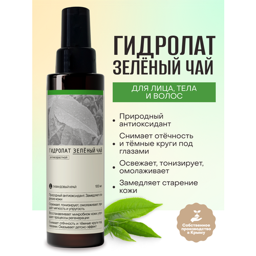 Гидролат - универсальный уход для кожи и волос. Это природный тоник, получаемый в результате дистилляции зеленого чая. Подходит для любого типа кожи.
