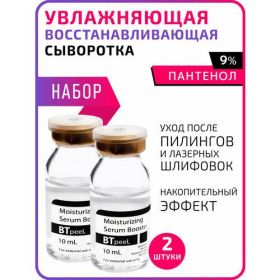Сыворотка-бустер BTpeeL с высоким содержанием пантенола, бетаина и гиалуроновой кислоты для быстрого восстановления, регенерации и увлажнения кожи. Является альтернативой и дополнением к инъекционным биоревитализантам. Значительно продлевает их действие, а в некоторых случаях полностью заменяет. Моментально восстанавливает водный баланс и смягчает кожу. Прекрасно подходит для реабилитации кожи после пилингов всех видов, в том числе лазерных. Снимает неприятные ощущения сухости и стянутости кожи после агрессивных процедур и ускоряет восстановительный процесс. Ускоряет регенерацию кожи после избыточной инсоляции, солнечных, химических и бытовых ожогов.