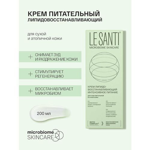 Липидовосстанавливающий крем LE SANTI MICROBIOME SKINCARE для интенсивного питания сухой, атопичной, проблемной и чувствительной кожи. Нежный крем интенсивно увлажняет, успокаивает кожу, нормализует ее гидро-липидный баланс, удерживает влагу в роговом слое кожи, образуя защитную мантию. Он станет вашим защитником в осенне-зимний сезон, в период отопления и холодов. Уходовая косметика для лица и тела повышает прочность коллагеновых волокон и запускает естественные защитные механизмы, существенно улучшая состояние взрослой и детской кожи. Подходит как для женской, так и для мужской кожи. В состав крема по уходу за кожей входит комплекс BIOTIC COMPLEX c пробиотиками и пребиотиками: восстанавливает естественный баланс микробиома кожи, помогает поддерживать кожу в спокойном и здоровом состоянии, увлажняет. Результатом ухода является максимально увлажненная и напитанная кожа, способная противостоять агрессивным внешним факторам окружающей среды. Видимый эффект отмечается уже на 21 день применения. Крем не содержит спирт, красители и другие агрессивные вещества. Безопасное и эффективное средство подходит для детей с 0 лет и взрослых. Питательный крем подходит для младенцев, маленьких девочек и мальчиков со склонной к атопии кожей, для девушек и парней - подростков, женщин и мужчин с ксерозом. Смягчающий увлажняющий крем Лесанти MICROBIOME SKINCARE не оставляет жирного блеска, быстро и хорошо впитывается, подходит для нанесения на кожу лица, рук и всего тела. Гипоаллергенный состав эмолента устраняет шелушение, зуд, Популярный крем бренда Ле Санти обладает нежной текстурой, подарит красоту и здоровье вашей коже. Увлажняющий крем Лесанти выпускается в красивой подарочной упаковке и способен стать практичным, полезным презентом для любимой девушки, подруги или супруги, мамы, сестры, бабушки и супруги. Большой формат – туба 200 мл – подойдет для всей семьи. Следите за нашими акциями и распродажами, вы можете купить наши товары в подарок со скидкой