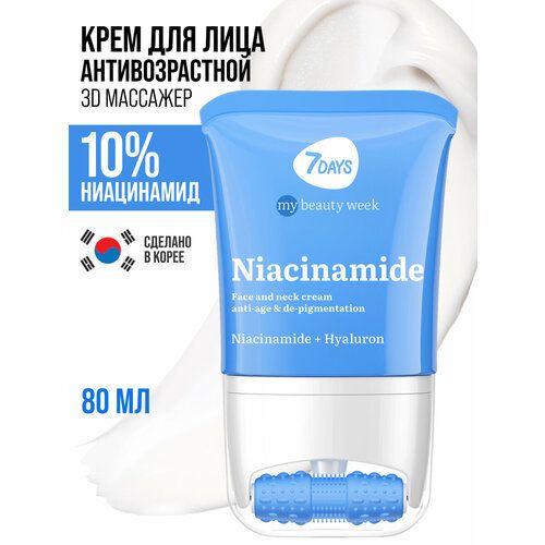 Крем для лица anti age питательный 7days My Beauty Week Niacinamide 10% 80 ml. Антивозрастной уход, питание, увлажнение, омоложение и массаж лица. Инновационное средство для ухода: Массажер для лица и Крем для массажа лица, шеи и зоны декольте 2В1. Крем для лица ниацинамид 10% (Витамин В3) стимулирует выработку кожей коллагена и эластина. Ниацинамид увеличивает эластичность кожи, против морщин, сужает поры, оказывает противовоспалительный эффект, борется с акне, осветляет пигментные пятна. Косметика Корея - Максимальное доверие покупателей
