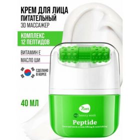 Крем для лица питательный anti age 7days My Beauty Week Peptide 40 ml комплекс 12 пептидов. Антивозрастной уход, питание, увлажнение, омоложение и массаж лица. Инновационное средство для ухода: Массажер для лица и Крем для массажа лица, шеи и зоны декольте 2В1. Крем для лица с пептидами повышает упругость кожи, оказывает лифтинг-эффект, предупреждает появление купероза, оказывает противовоспалительный эффект, эффективен против морщин. Косметика Корея - Максимальное доверие покупателей нейропептиды и сигнальные пептиды - стимулирует выработку кожей коллагена и эластина, имитируют ботокс и мягко расслабляют мышцы лица; иммунные пептиды - ускоряют регенерацию и минимизируют акне; пигментные пептиды - освятляют кожу, устраняют пигментацию и матируют. Массажер для лица с комплексом 12 пептидов - эффективный уход за кожей лица, заменяющий многоступенчатый уход за лицом.