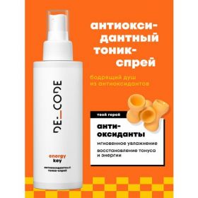 Антиоксидантный тоник-спрей используйте как многофункциональный продукт — тоник для лица, тонер для лица, увлажняющий мист для лица, освежающий спрей для лица. Антиоксиданты — герой и ключевой ингредиент средства. Помогают от пигментных пятен на лице, эффективны от пигментации, возникающей повторно. Сдерживают окислительный процесс в клетках, снижают стрессовую реакцию на солнечные лучи и предотвращают преждевременное старение. Витамин С усиливает эффект в борьбе с гиперпигментацией. Результат после применения: мгновенное увлажнение без липкой плёнки, восстановление тонуса и энергии. Коллекция средств линейки Energy Key от DE_CODE поддерживает энергетический баланс, восполняет здоровое сияние.