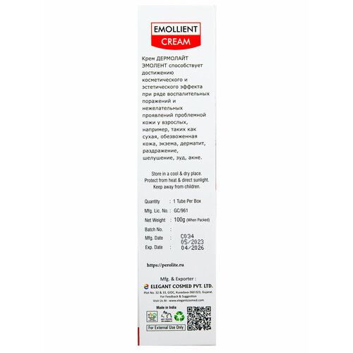 Крем дермолайт эмолент способствует достижению косметического и эстетического эффекта при ряде воспалительных поражений и нежелательных проявлений проблемной кожи у взрослых, например, таких как сухая, обезвоженная кожа, экзема, дерматит, раздражение, шелушение, зуд, акне.