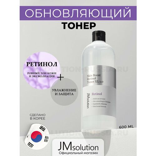 Тонер-бустер JMsolution Skin Boost Retinol Toner XL 1.0 представлен в удобной упаковке-бутылке объемом 600 мл. Продукт имеет косметический аромат и подходит для нанесения на лицо, кожу вокруг глаз, шею и декольте.
