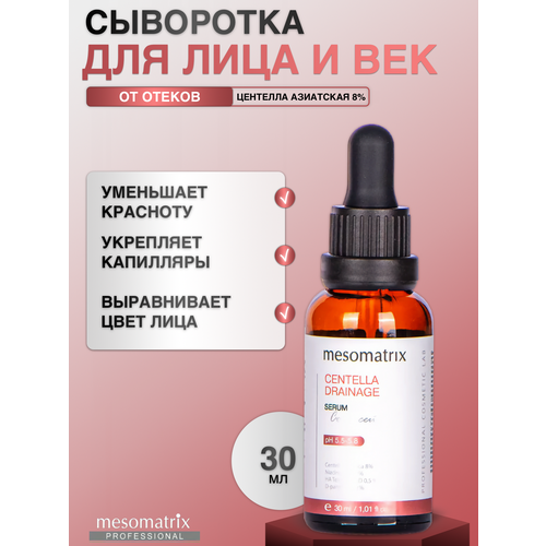 Сыворотка Centella Drainage Mesomatrix с центеллой азиатской 8%, ниацинамидом и кофеином - это эффективное средство для лимфодренажа на лице и теле. Она успокаивает кожу и имеет антикуперозный эффект.