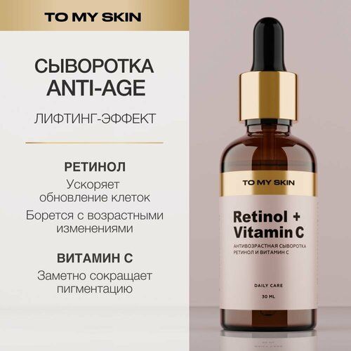 Сыворотка для лица — активный уход, который эффективно корректирует морщины, оказывает заметный лифтинг эффект и осветляет пигментацию. Сыворотка для лица с ретинолом с мощной комбинацией антивозрастных ингредиентов также станет профилактикой преждевременного старения. Кожа надолго сохранит свежесть и эластичность Ретинол в профессиональной формуле сыворотки для лица — биодоступная форма витамина А, которая отлично усваивается кожей. Сыворотка для лица антивозрастная на клеточном уровне ускоряет синтез белков молодости и упругости — коллагена и эластина. Кожа естественным образом становится более гладкой и плотной, контуры лица — подтянутыми, сокращаются пигментные пятна. Состав сыворотки с витамином С для лица усиливает омолаживающее действие ретинола. Витамин С наравне с ретинолом восстанавливает собственный коллаген и работает как сильный антиоксидант, защищая клетки от повреждений и продлевая молодость. Благодаря рабочей концентрации ингредиентов сыворотки для лица с доказанной эффективностью сыворотка для лица с ретинолом и витамином C дает результат уже после первых применений. Текстура сыворотки от морщин легкая и мгновенно впитывается.